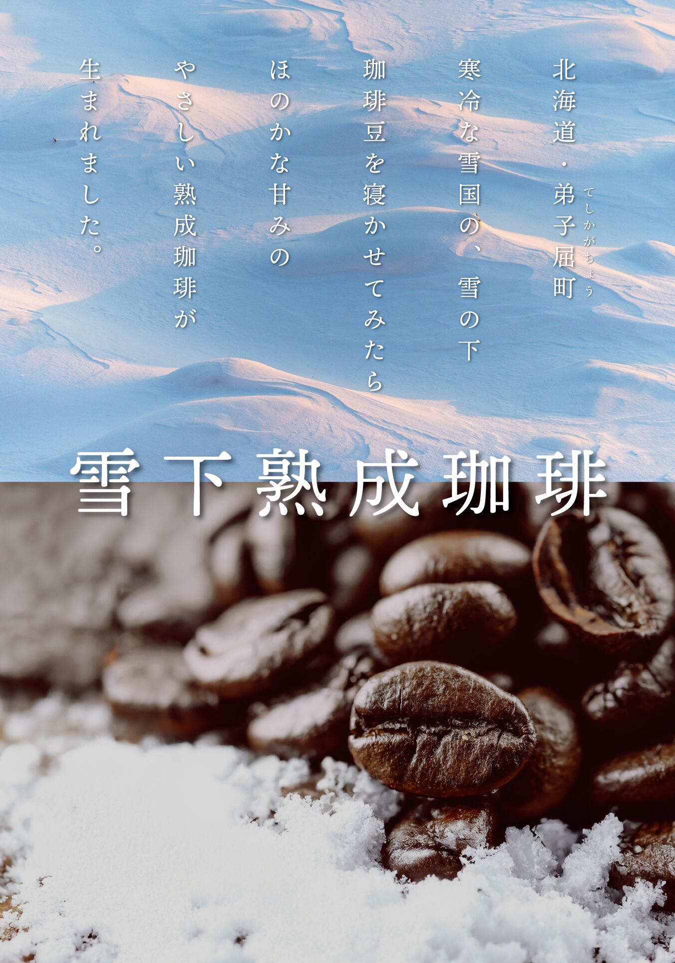 摩周湖の湧水で洗った生豆を、北海道の雪の中で100日間ゆっくりと熟成させまろやかな甘みとコクを追求した高貴な一品です。雪の中は一定の低温・高湿度を保つことができるため安定して熟成させることができます。低温熟成のため、コーヒーの雑味が軽減され、まろやかで深い味わいを実現することができます。
