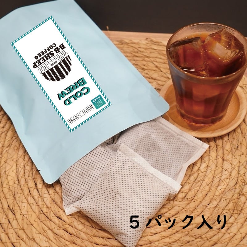 湖水コーヒーを使用した水出しコーヒーです。1袋にコーヒーパックが5個入っており、1個で300mlのアイスコーヒーを楽しめます。使い方はピッチャーなどに、コーヒーパック1個と水を300ml入れて、9時間冷蔵庫で保存してください。長時間じっくりと抽出することで、深煎りの濃厚な風味が香りつつも、キリっとした清涼感のある飲み口をお楽しみいただけます。