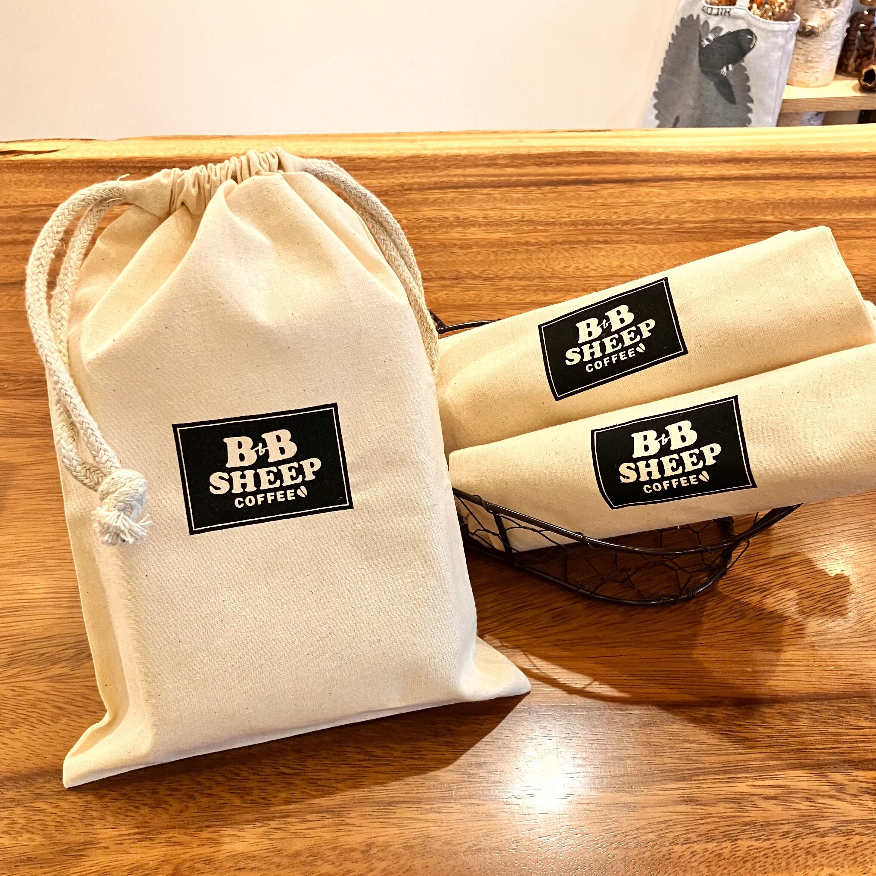 BB SHEEP COFFEEのロゴがワンポイントのオリジナル巾着です。綿素材で使い勝手の良いコットン巾着は、やわらかい生地感で中に入れる商品をやさしく包み込みます。